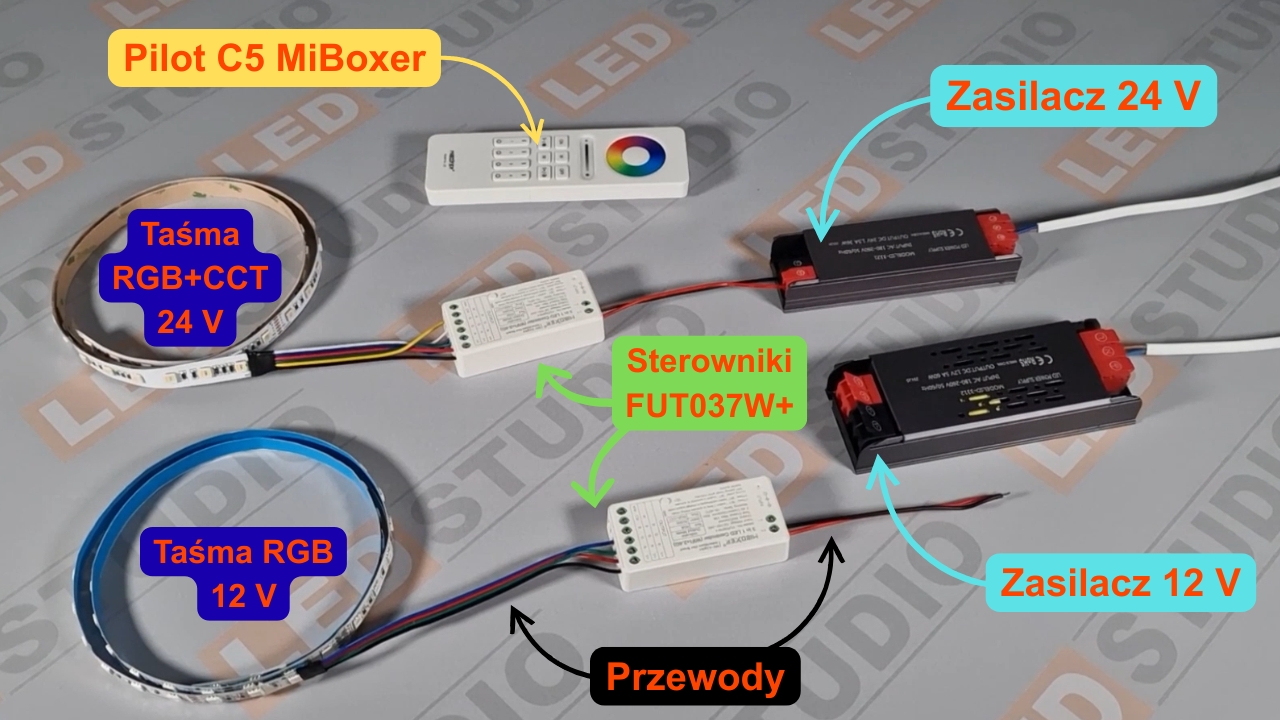- przewody – łączące taśmę LED z odbiornikiem i odbiornik z zasilaczem,