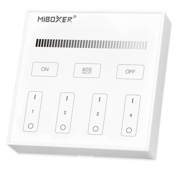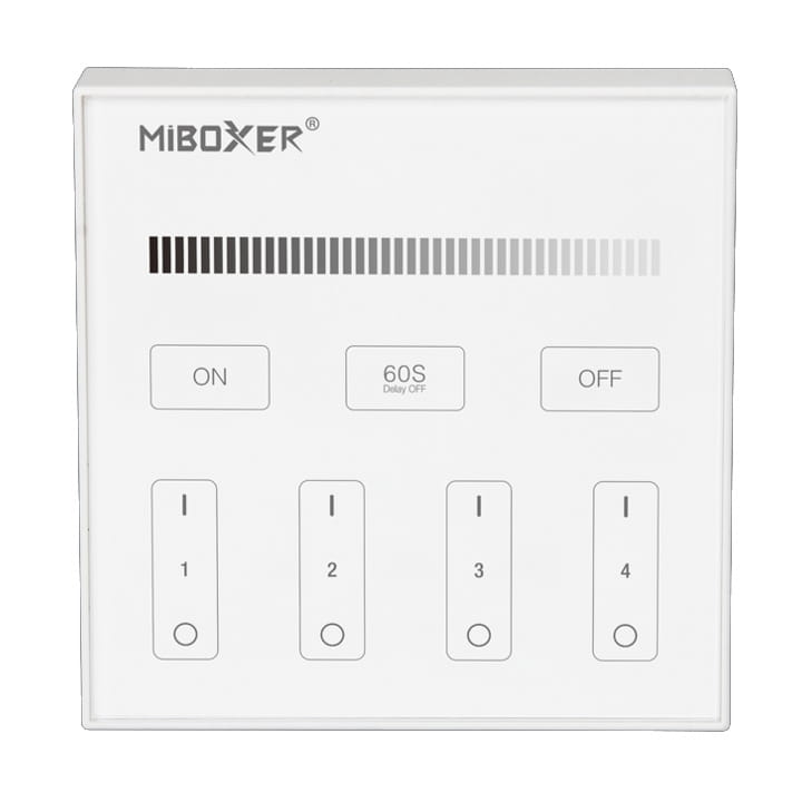 Pilot sterujący naścienny biały MiBoxer B1 to bezprzewodowy pilot radiowy w kształcie panelu dotykowego, który służy do sterowania, do czterech niezależnych stref oświetlenia LED jednobarwnego białego oraz taśm LED ze światłem białym i do taśm ze światłem jednokolorowym, na sterownikach FUT MiBoxer.
