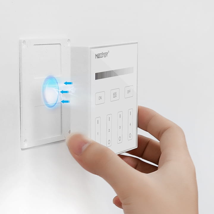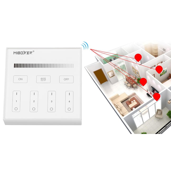 Panelem można sterować bezprzewodowo oświetleniem od 1 do 4 niezależnych stref LED. Do jednej strefy na pilocie może być podłączone wiele obwodów z oświetleniem LED za pomocą odbiorników MiBoxer FUT.