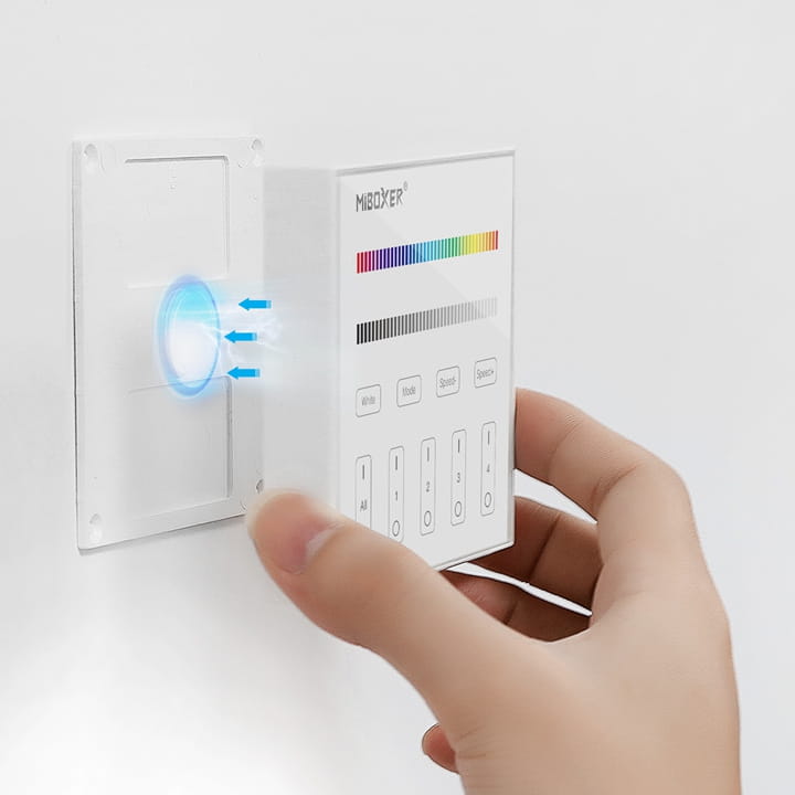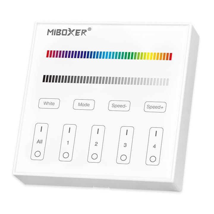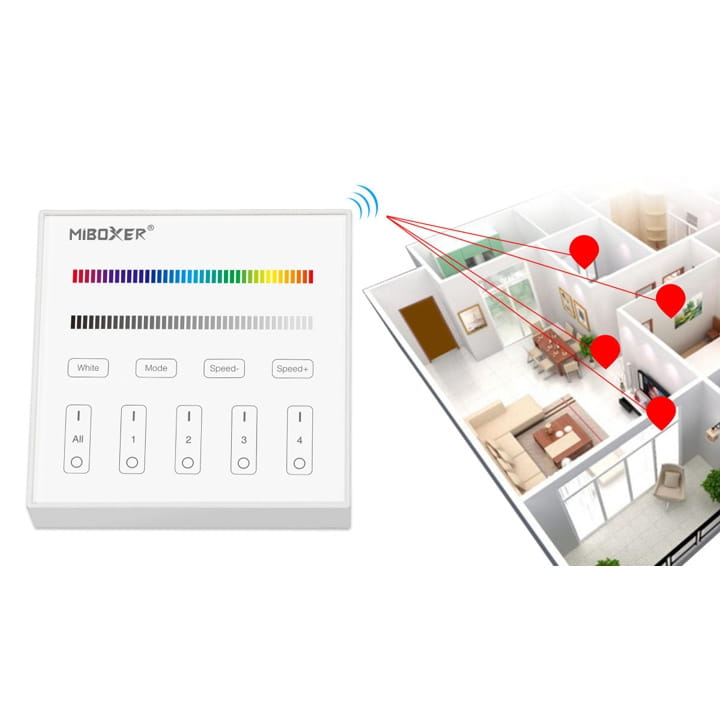 Panelem można sterować bezprzewodowo oświetleniem od 1 do 4 niezależnych stref LED. Do jednej strefy na pilocie może być podłączone wiele obwodów z oświetleniem LED za pomocą odbiorników MiBoxer FUT.