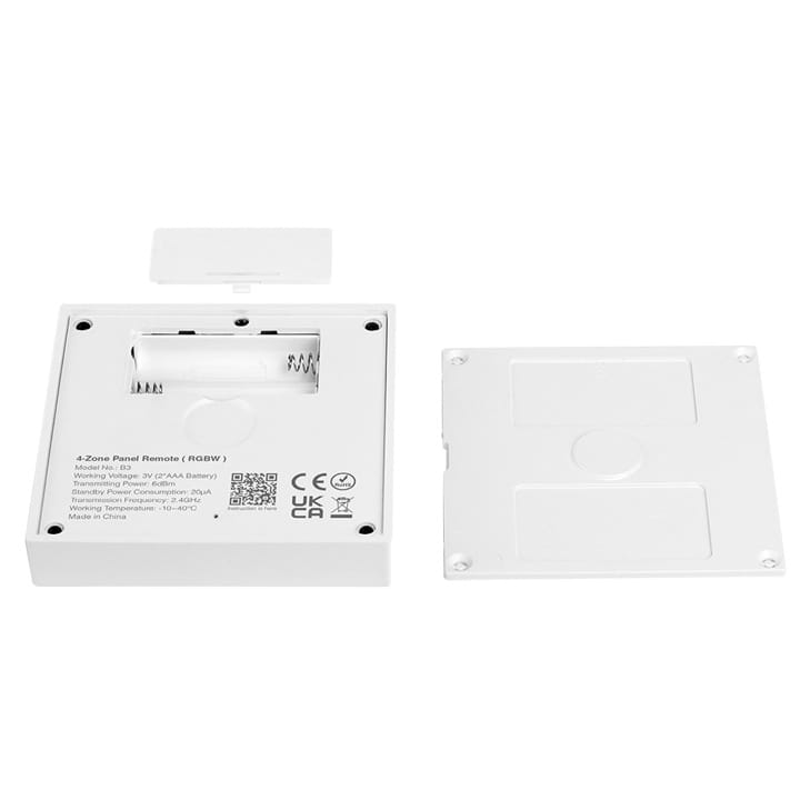 Panel sterujący B4 w kolorze białym, to uniwersalny pilot bezprzewodowy radiowy w kształcie panelu dotykowego, który służy do sterowania ,do czterech niezależnych stref oświetlenia LED RGB i RGBW, oraz taśm LED RGB, RGBW, na sterownikach FUT MiBoxer.