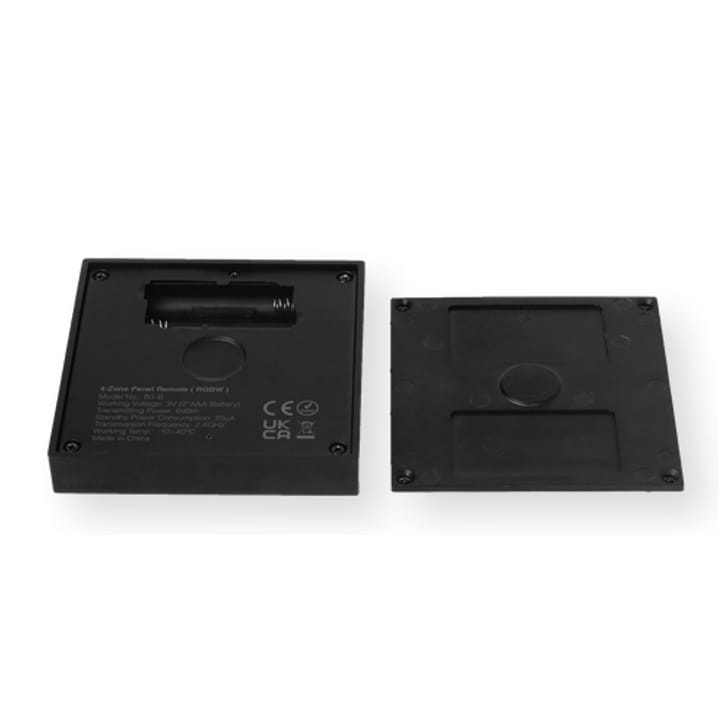 Panel sterujący B4 w czarnym kolorze, to bezprzewodowy pilot radiowy w kształcie panelu dotykowego, który może sterować do czterech niezależnych stref oświetlenia LED RGB i RGBW, oraz taśm LED RGB, RGBW, na sterownikach FUT MiBoxer.