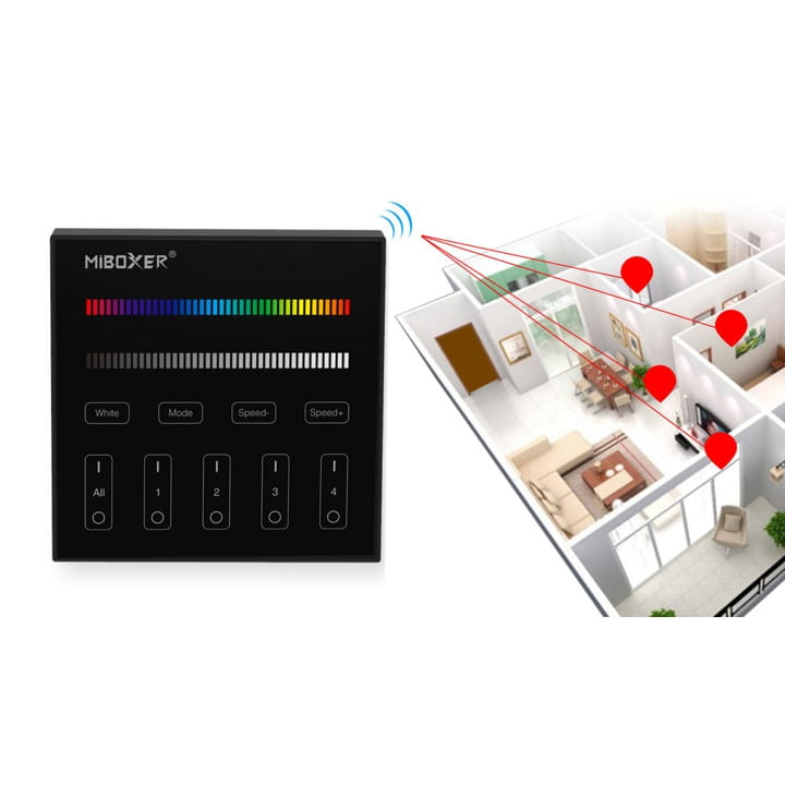 Panelem można sterować bezprzewodowo oświetleniem od 1 do 4 niezależnych stref LED. Do jednej strefy na pilocie może być podłączone wiele obwodów z oświetleniem LED za pomocą odbiorników MiBoxer FUT.