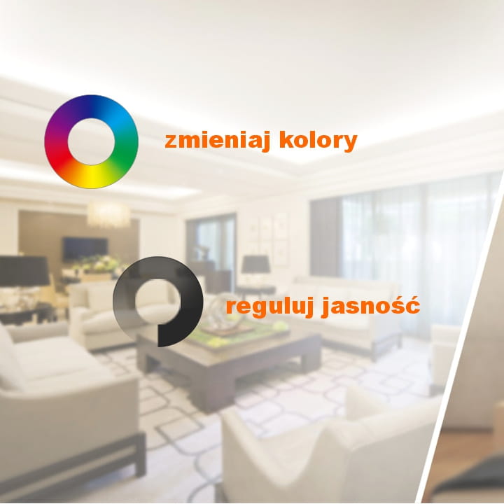 - zmiana natężenia jasności światła w taśmach kolorowych taśmach Led RGB i RGBW,