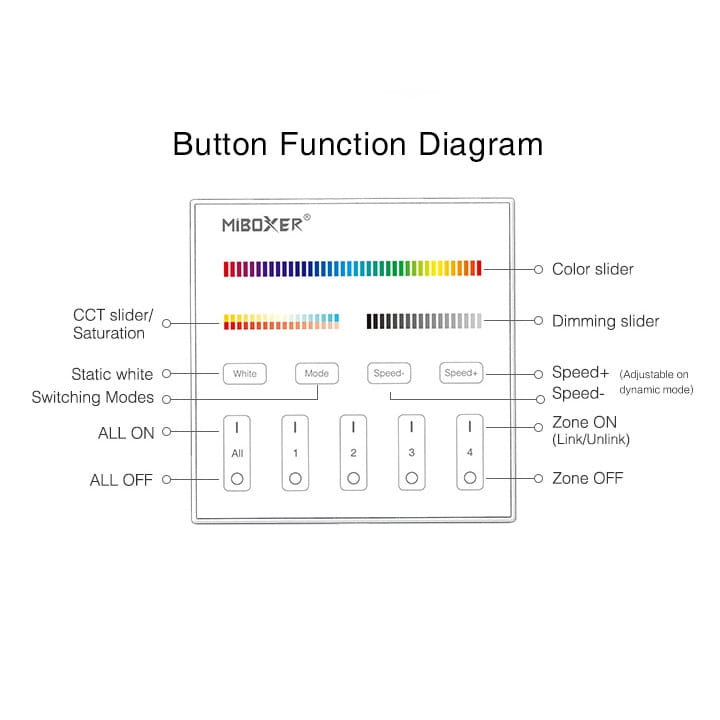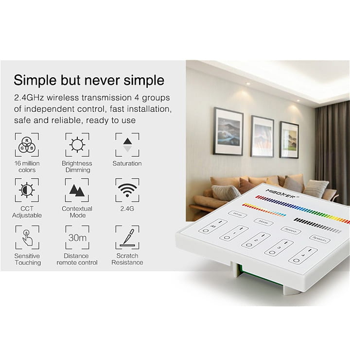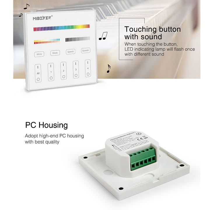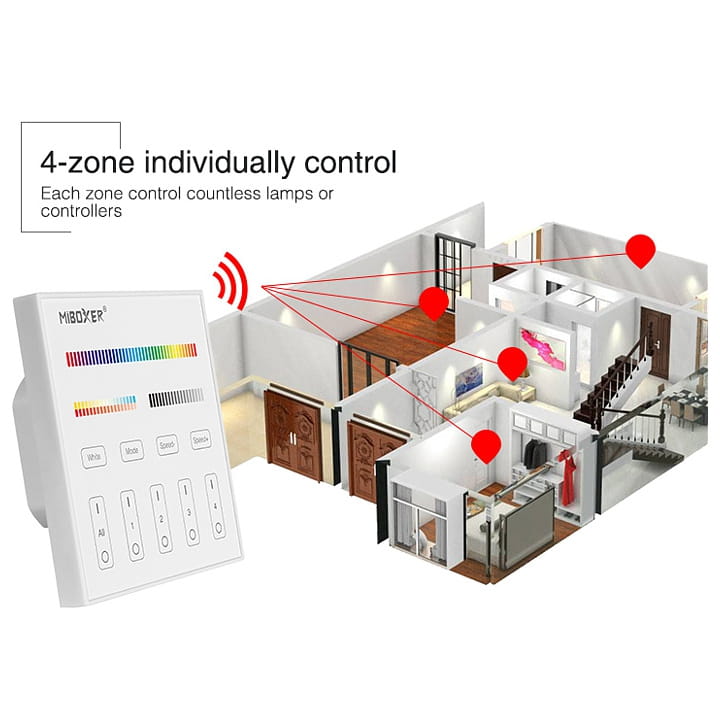 MiBoxer T4, to 4-strefowy pilot w formie panelu na ścianie obsługiwany dotykowo. Umożliwia zmianę koloru, nasycenia koloru, temperatury barwowej oraz jasności przypisanych urządzeń, i oświetlenia opartego na sterowaniu MiBoxer.