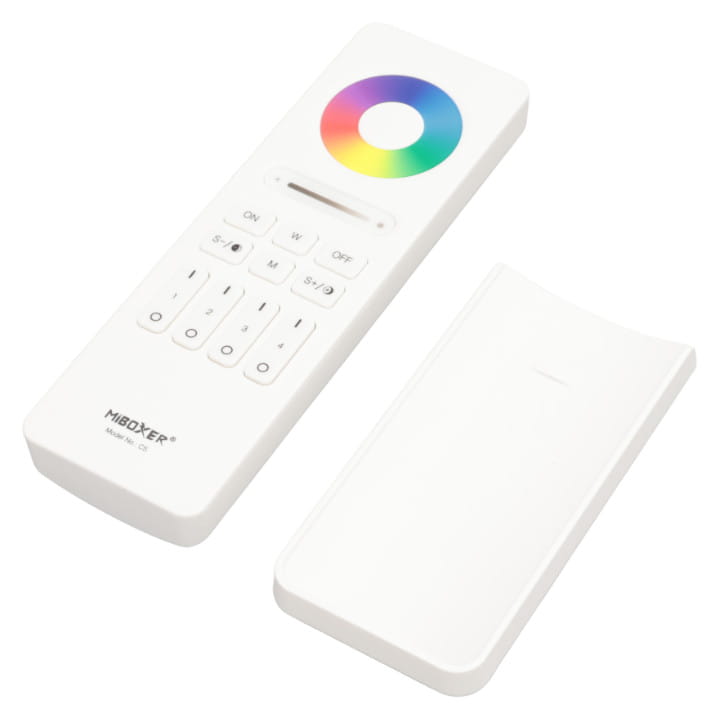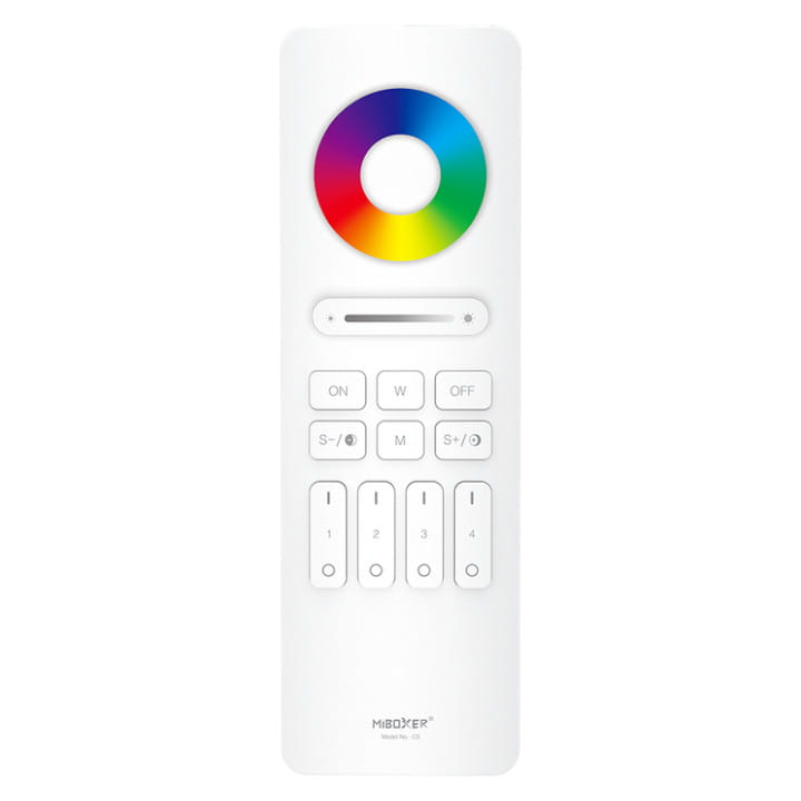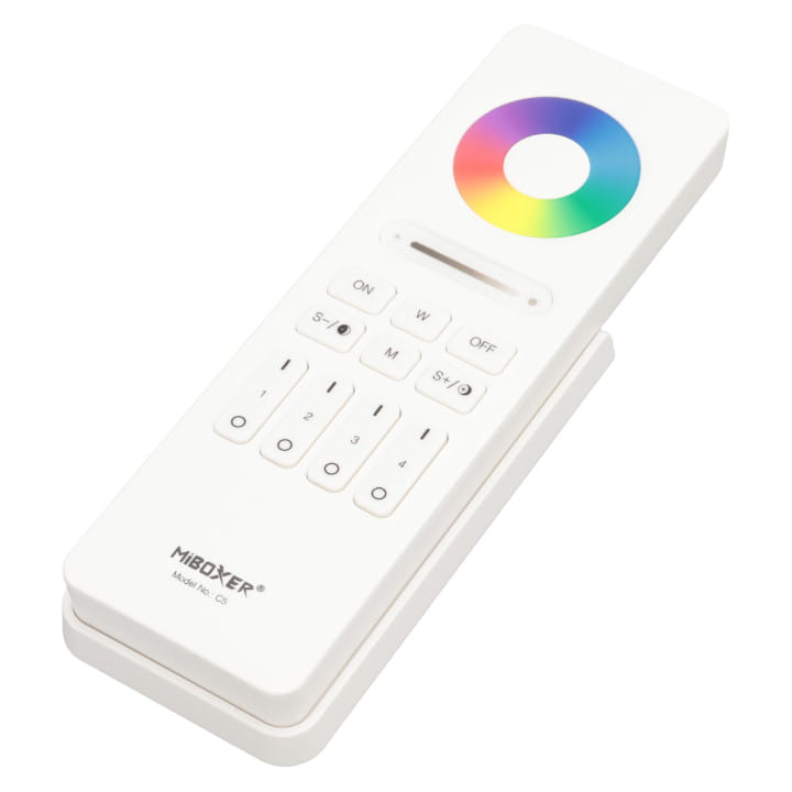 Pilot C5 umożliwia zdalne sterowanie oświetleniem taśm LED nawet na czterech osobnych strefach, zarówno kolorowych RGB jak i multiwhite ze zmiennym światłem białym CCT. Komunikacja radiowa 2.4 GHz pilota z odbiornikami umożliwia płynne i bezproblemowe sterowanie sterownikamiu MiBoxer.