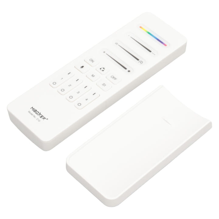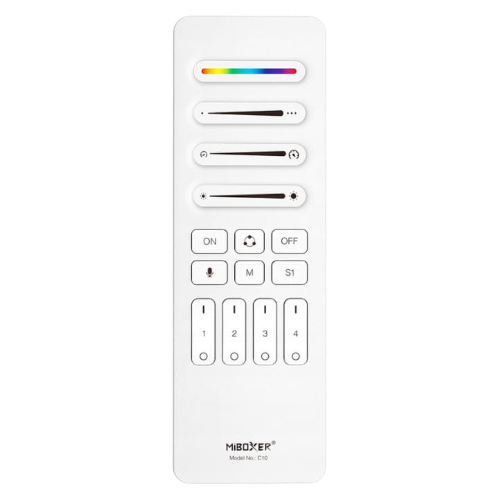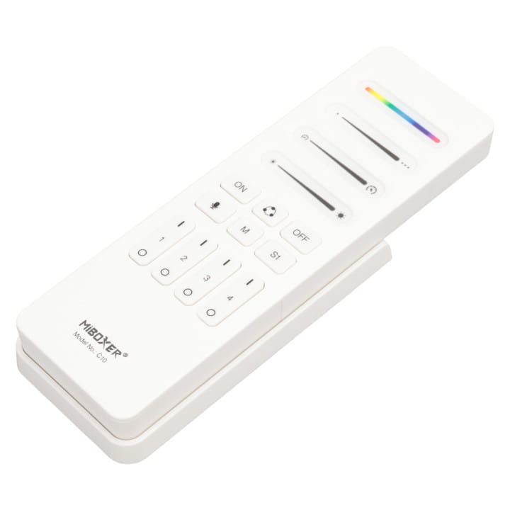 Pilot C10 pozwala zdalnie sterować czterema strefami oświetlenia taśm cyfrowych LED. Komunikacja radiowa pilota z odbiornikami umożliwia płynne i bezproblemowe sterowanie kontrolerami SPI MiBoxer.