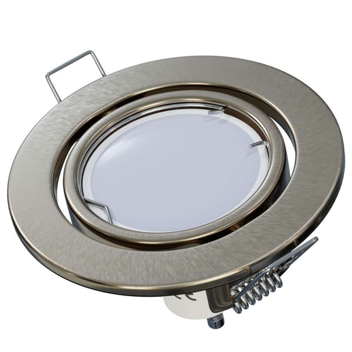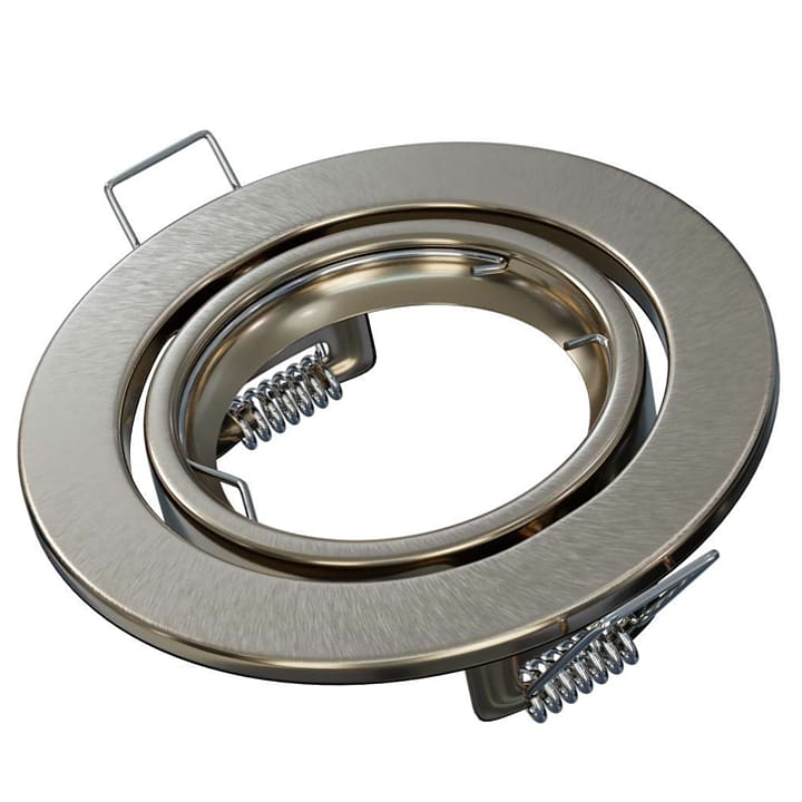 Okrągła ruchoma oprawa sufitowa podtynkowa przystosowana na żarówki GU10 lub MR16 o wymiarach 85mm x 80mm, w kolorze srebrnej satyny.