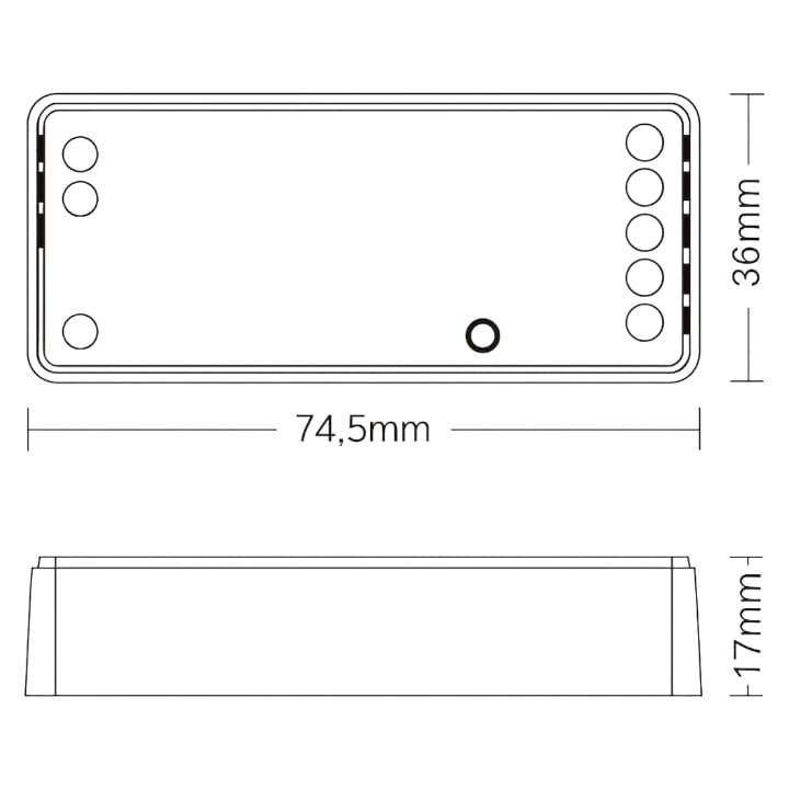 Wymiary sterownika (dł. × szer. × wys.): 74 × 36 × 17 mm