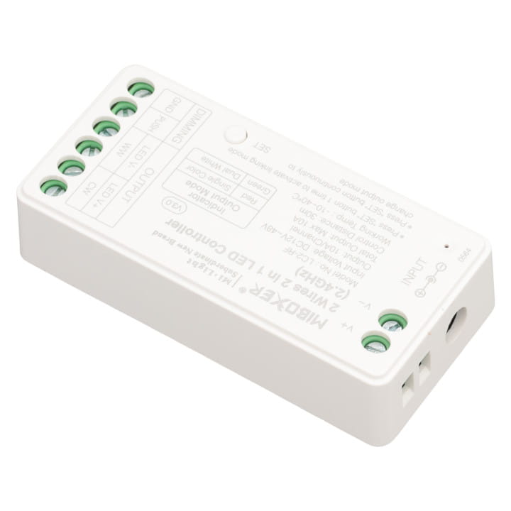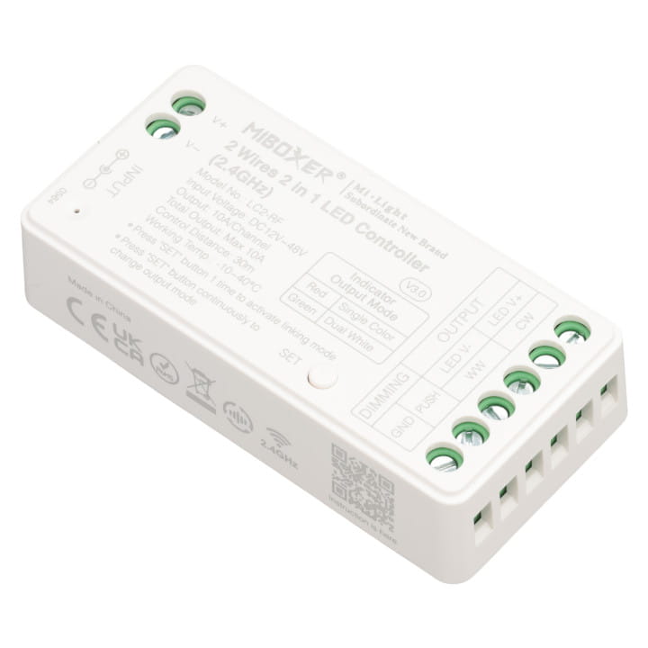 Sterownik LC2-RF to sterownik ze ściemniaczem do LED, który obsługuje taśmy MONO jednobarwne oraz dwużyłowe taśmy CCT multibiałe.
