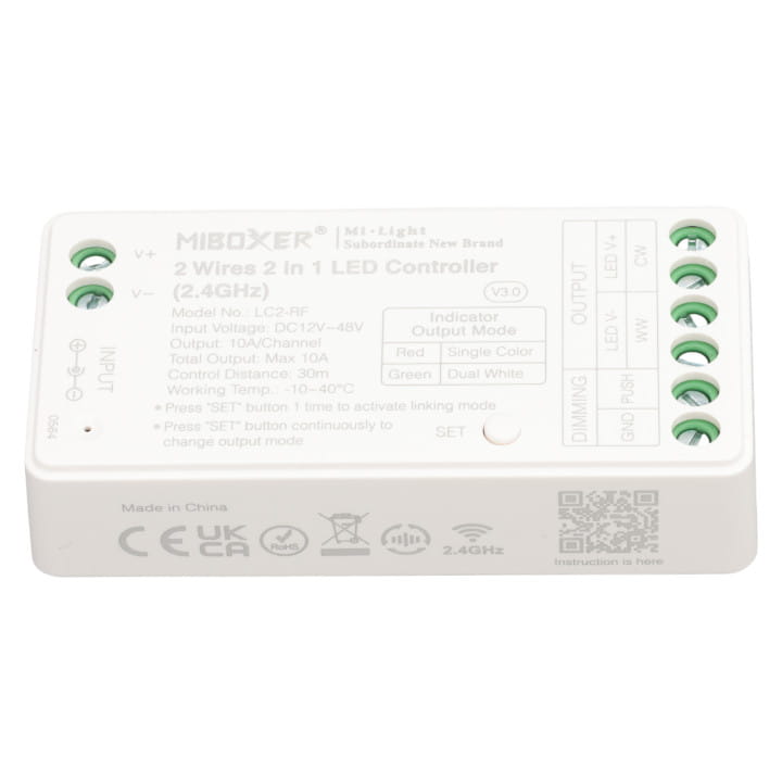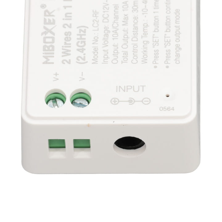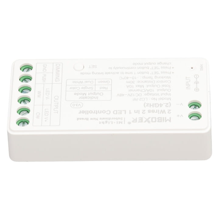 LC2-RF służy do sterowania taśmą LED jednobarwną mono oraz do sterowania dwużyłową taśmą CCT (multiwhite ze zmienną barwą światła od 2700K do 6000K). Sterownik z funkcją ściemniania (taśmy mono, CCT) oraz zmianą temperatury barwowej (taśmy CCT).