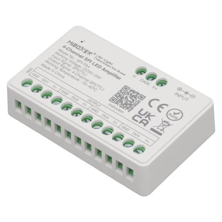 Wzmacniacz do taśmy LED cyfrowej SPI-PA4 to urządzenie służące do wydłużania zasięgu instalacji LED, które dodatkowo pozwala synchronicznie sterować dłuższymi odcinkami taśm LED. Wzmacniacz SPI-PA4 wysyła sygnał do czterech kanałów jednocześnie, umożliwiając aż czterokrotne wydłużenie połączenia.